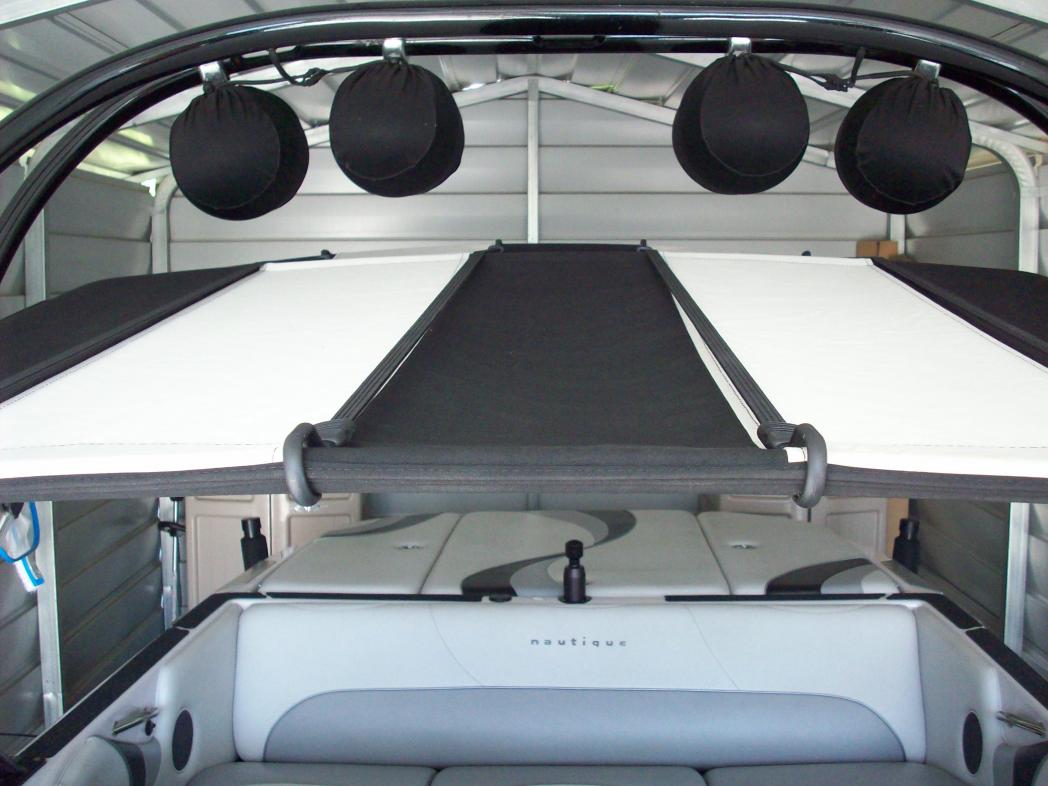 If you have an under tower mount bimini, this works well and it's cheap. The bungie chords are from Home Depot. I think they are the 42" size. The last picture is what I do if it's too cold for the bimini. The chords are just hooked together under the engine cover.