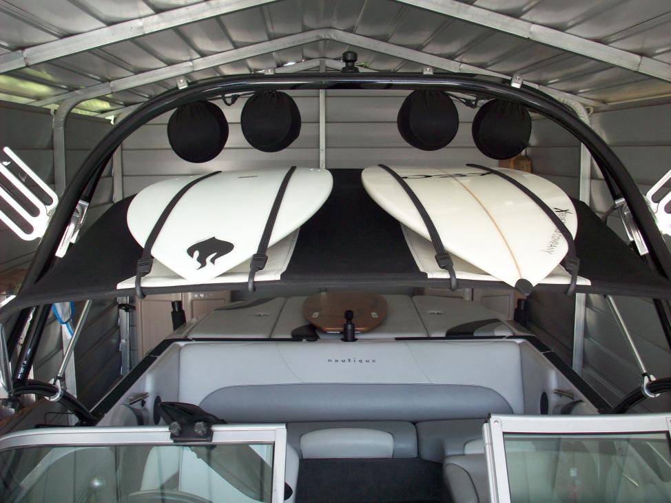 I'm looking for suggestions for a rack to mount my wakesurf board. FCT with Flight Clips on both sides, was thinking about mounting it on top of the tower somehow, but also have the Nautique double speaker cans mounted up there??? Any suggestions would be appreciated, don't even want to bring my board if I can't get it up outta the boat.