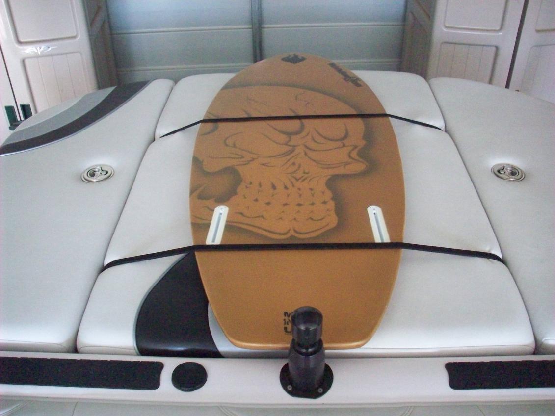 I don't know what board you ended up getting, but I used to keep it between the drivers seat and the side of the boat. It slid in there perfectly. I have a Hyperlite Broadcast, so it was pretty thin.
