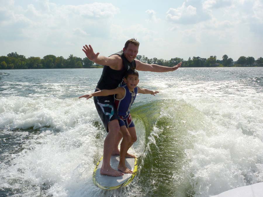 I don't.... I will try to get around to posting our videos. To get up with them on a surfboard is easy. have them in front of you and in the same position. Have your arms under theirs to get up. Once up and stable switch your arms to over theirs on at a time. You will inevitably have to get them to adjust their feet a little. Have them hold your legs until you toss the rope into the boat.
