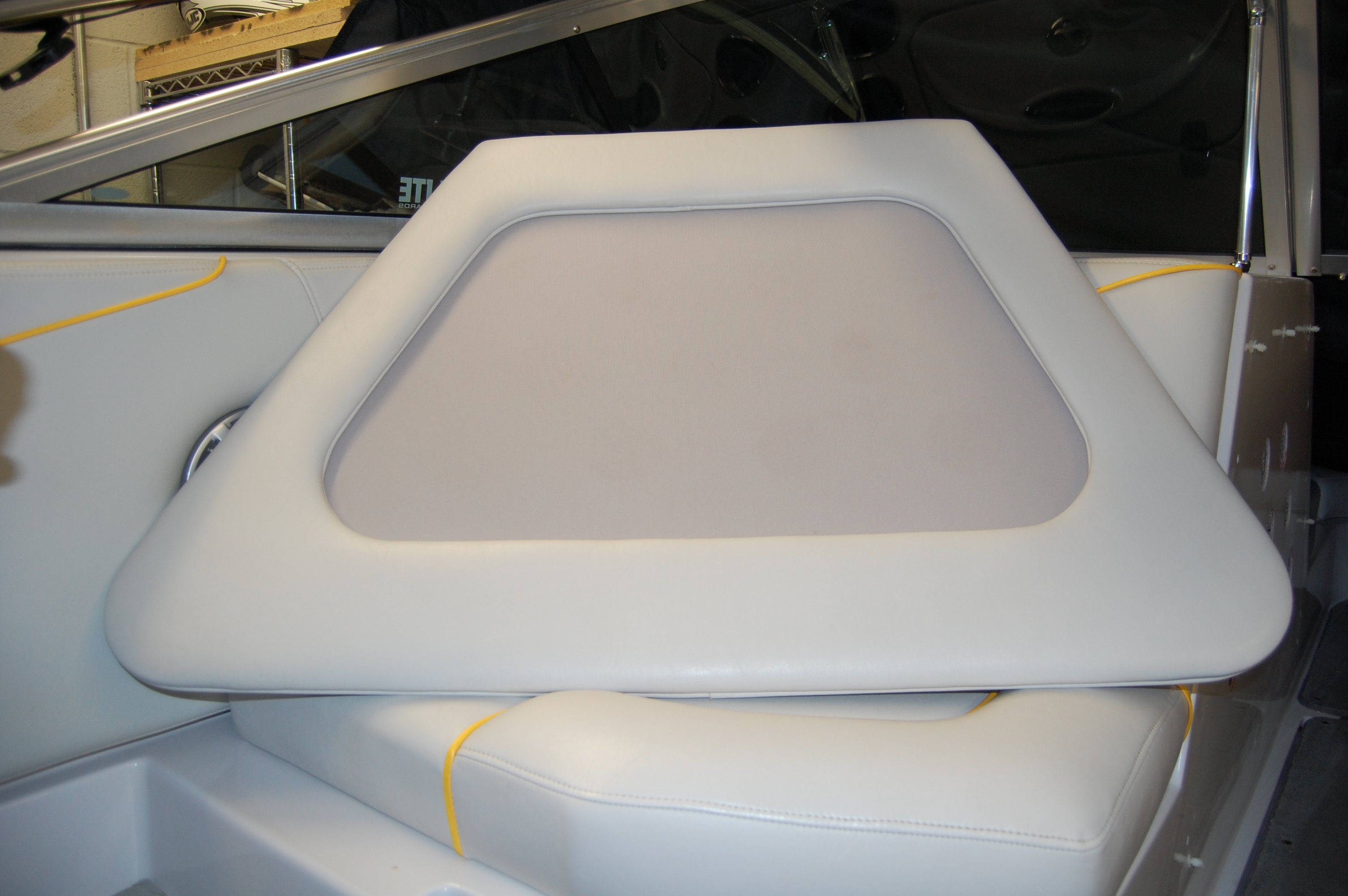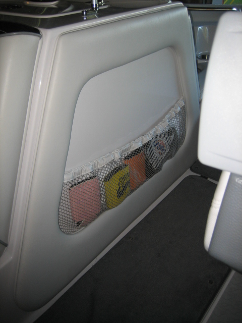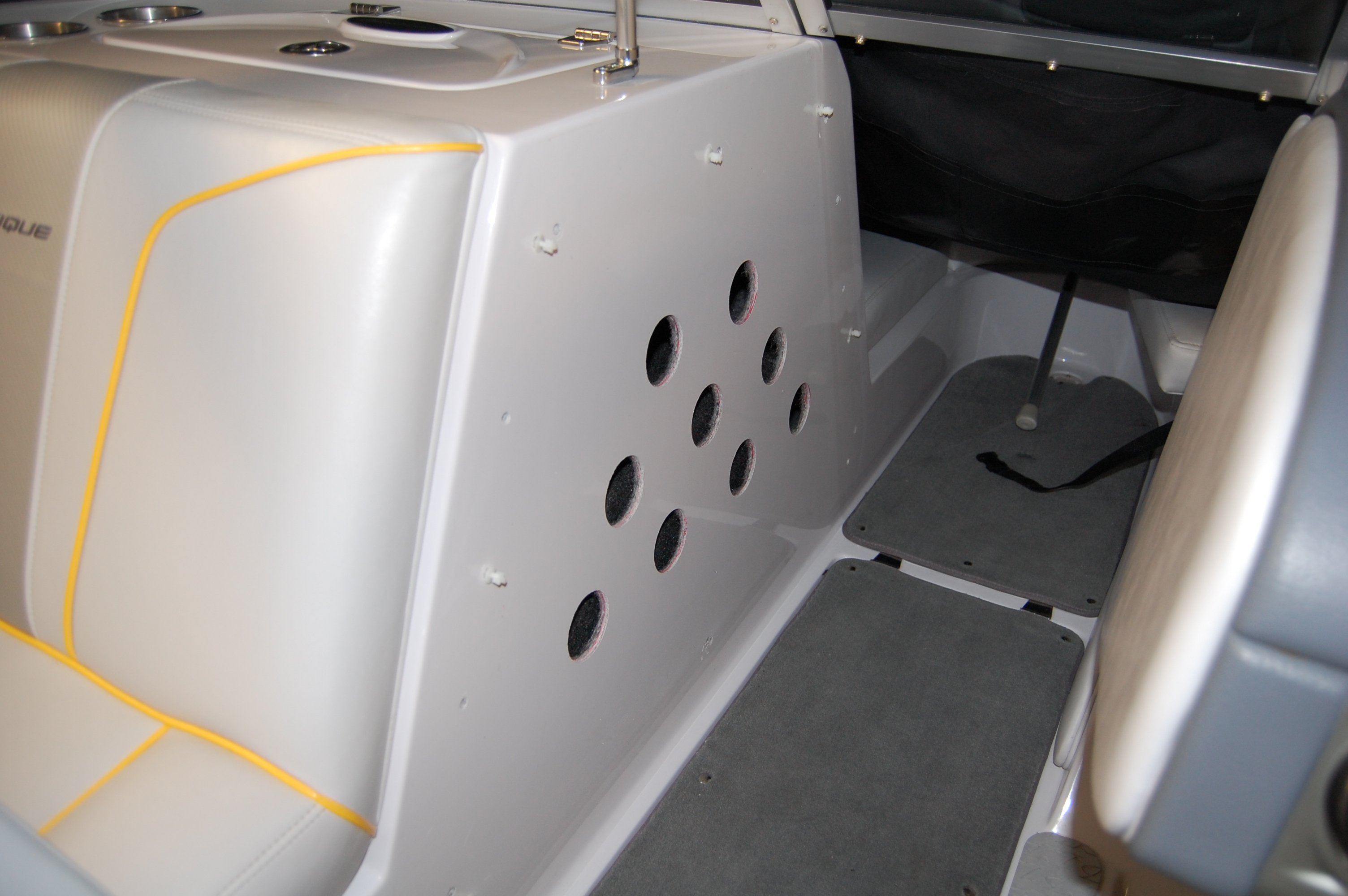 Andyray- here are some pictures of how I vented the side of the sub compartment. It was easy and very inexpensive to do. I started out by getting a piece of plywood I had laying around. Remove the cushion that is on the side of the compartment. Place it over the plywood and trace it to get the shape to cut. Next cut the plywood and layout your design for you holes. Reinstall the cushion on the side of the compartment. Drill small pilot holes in the wood and place it inside of the cushion. Then drill small pilot holes in the fiberglass. After it was layed out I removed everything again to make sure I didn't damage any of the vinyl while drilling and drilled the holes with a holesaw. Once everything was drilled and ready, I removed the netting on the backside of the vinyl (I didn't ever plan on using it) and used a piece of fabric (purchased at wal mart for a couple of dollars) to cover the entire open area of the cutout. I am very happy with how it turned out and it was very inexpensive to do. I used stainless staples to attach the fabric to the factory template. Here are some pictures. Also is a picture of the MDF box I have if anyone is interested let me know and it's yours for free. Just give me until next week to ship it out because this week I won't have time due to my job.