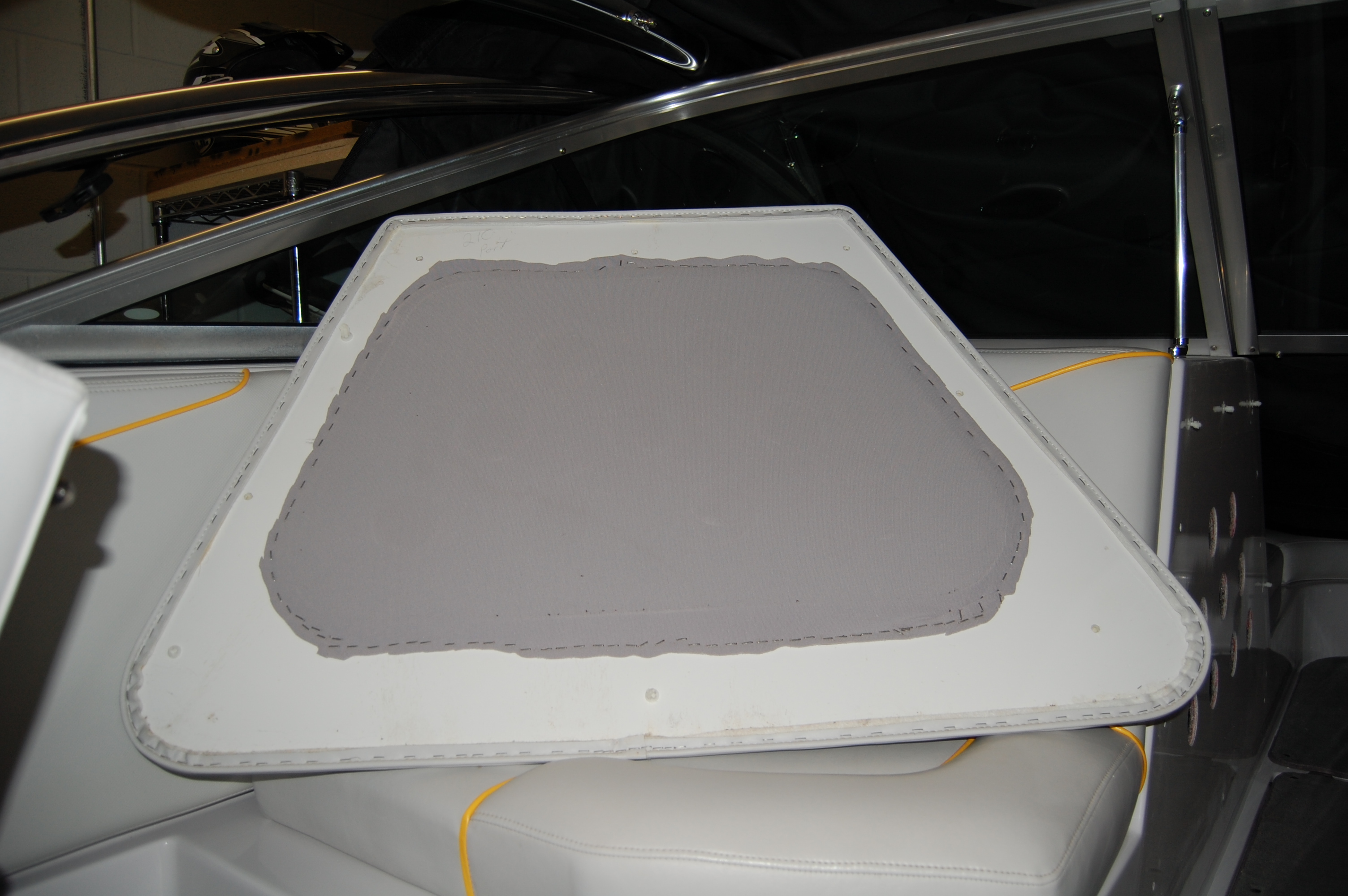 Latonkaboarder: I am a little confused and that doesn't take much. Did you just use the new plywood template to drill holes in the fiberglass and in the backside of the existing board that supports the cushion? Why drill holes in the back of the cushion, to let the sound out? What did you do with the foam behind the vinyl did you leave it there or did you try to remove it?