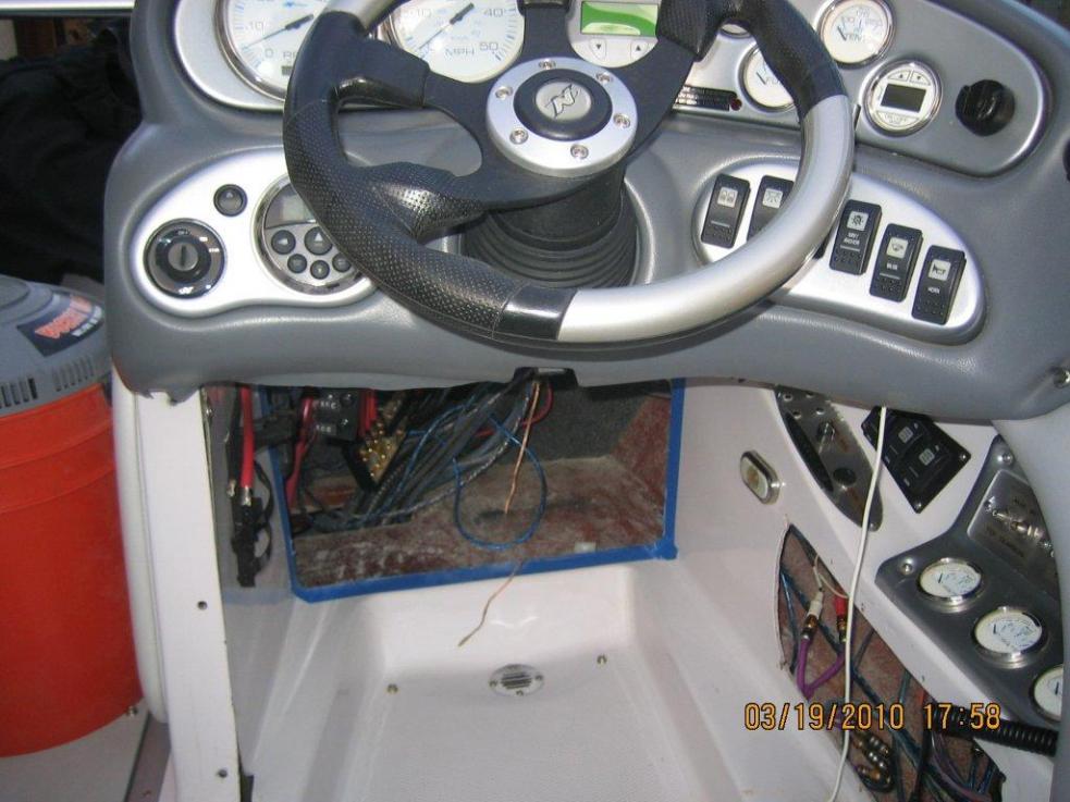 Too bad about the box. I opened up the footwell of my boat and re-routed all of the cables, hoses, and wires in that space then built a 2 cubic foot slot ported custom box for a Boston SPG555 sub. I am very happy with the result. Unfortunately to get it in I had to pull the dash and steering gear to allow for enough clearance to get it in place. I also had to trim the lower edge of the fiberglass below the steering wheel.