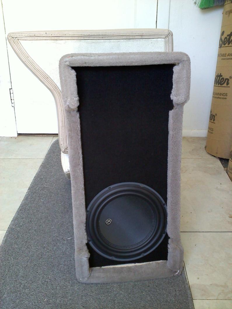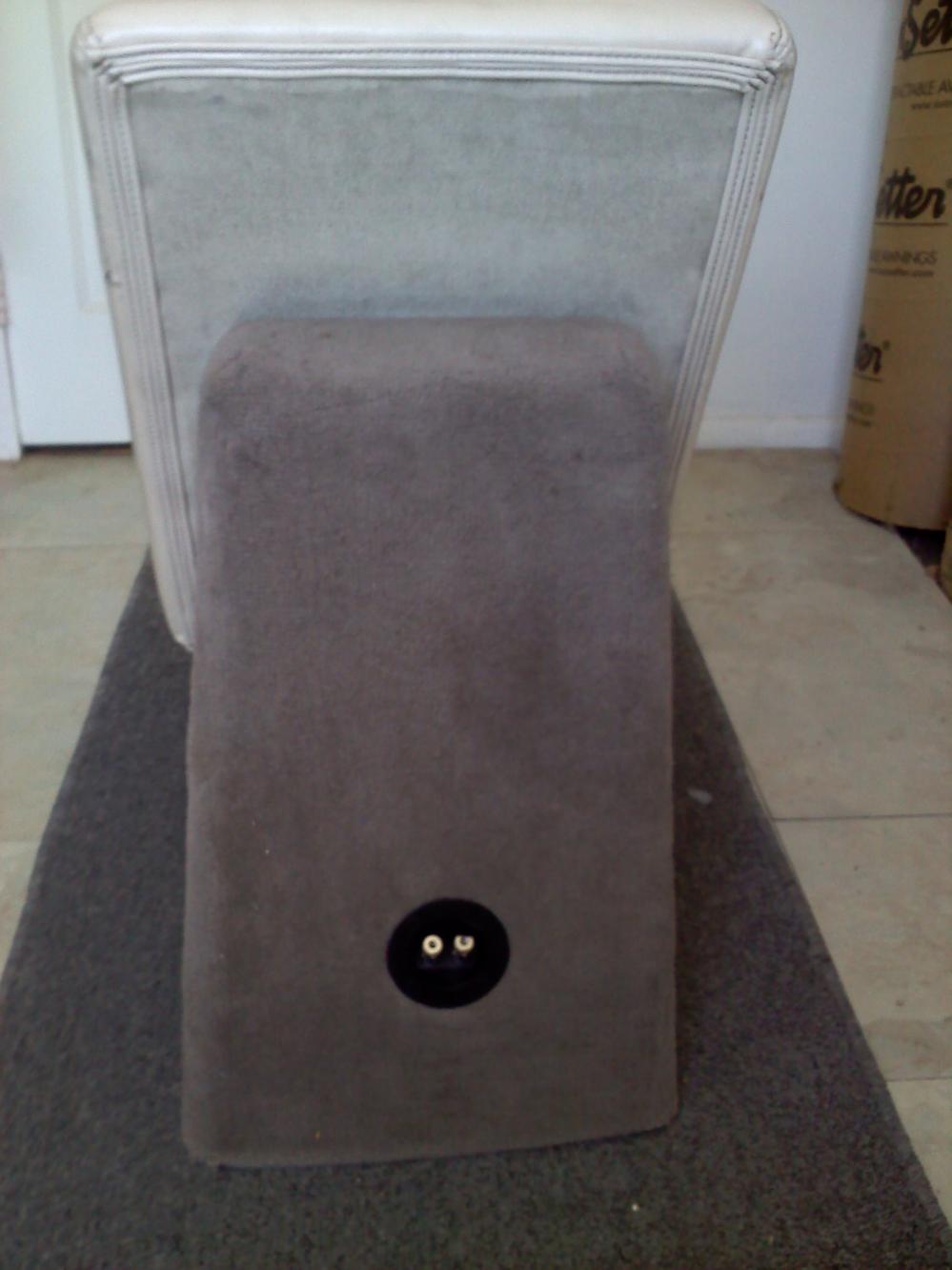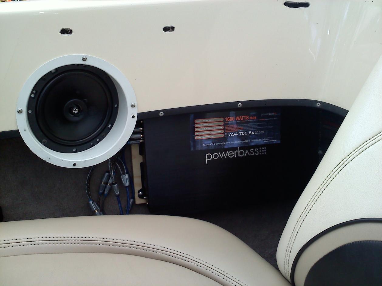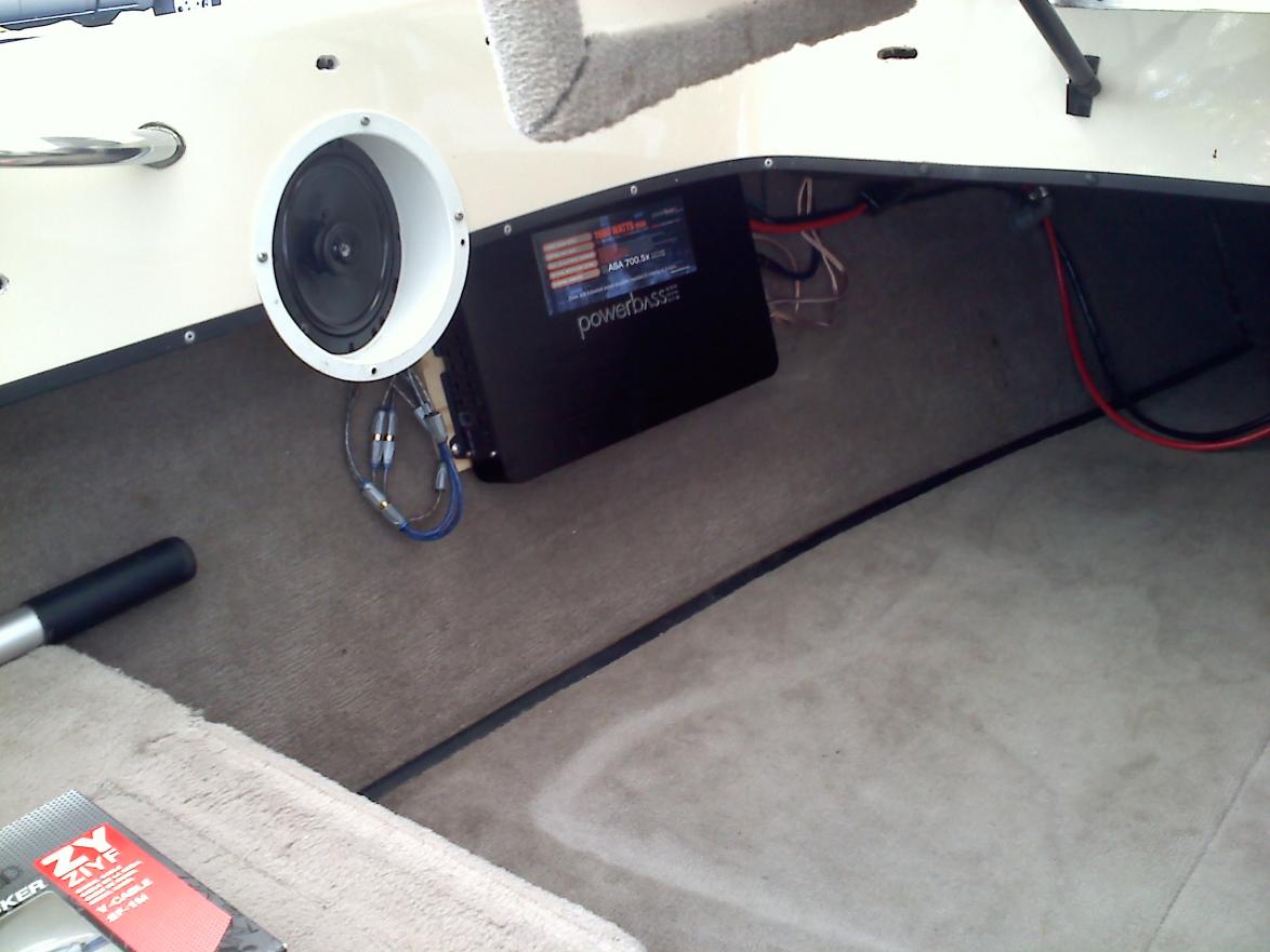 I liked the idea of building the down-firing sub box in the open space behind the drivers seat, but that is where I usually have a lage ice chest and the jump seat. When the jump seat is rear facing up front, it limits access to the drivers seat and the front of the boat,so it is usually behind me. I had a box built and sealed inside the Jump seat. It's the percect size for a 10" down-firing Sub. I added "banana plugs" to the back of the seat so it is still movable or removable if I ever wanted to.