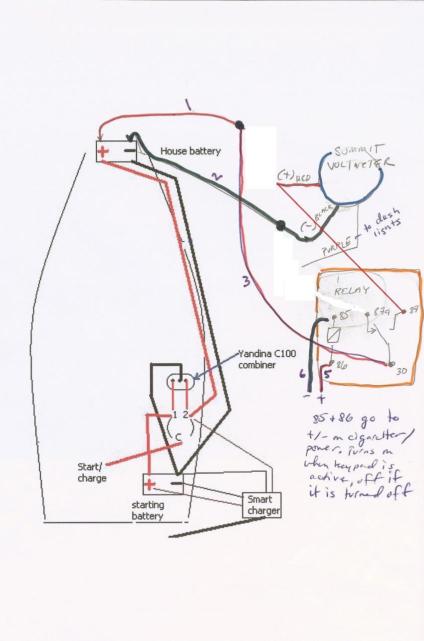 The gauge has 3 leads, a RED, BLACK and PURPLE. Since this gauge isn't switched and I don't want it on all the time I plan on using a relay and wiring it to the keypad power. I think I have that part figured out -- hooking it to the +/- of the power outlet on the driver side panel energizes/de-energizes the relay the way I'd like it. The issue tho, is how where do I hook up the RED and BLACK leads? I tried as indicated in the attached diagram hooking to the house battery, no dice. Not only did I get no reading, the leads got really hot really quickly. Not good. Any electrical guru's out there have any advice on what I might be doing wrong?