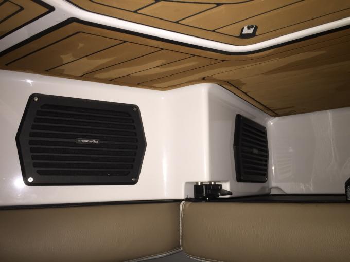 I used one amp to power the tower speakers, I used one amp to power to the in-cabin speakers, and one 1600 watt amp to power the 2 12" subwoofers. I added the Wet-Sounds EQ to control the Bass and treble to each zone of the boat.