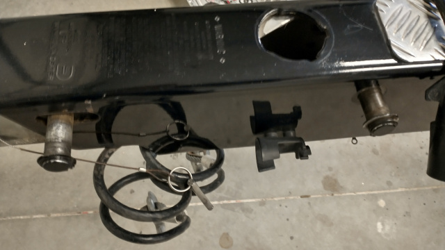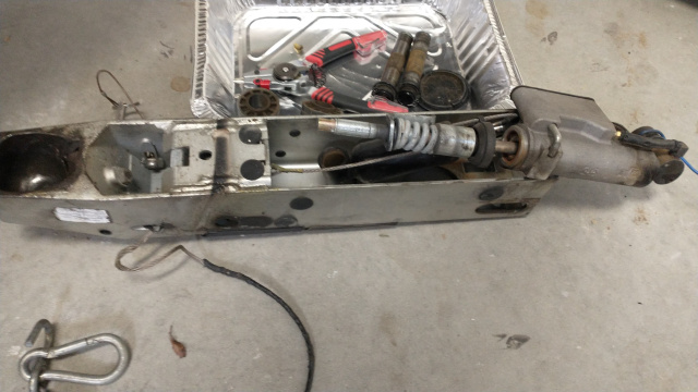 Pulled my brake actuator to replace a mangled break away cable from the previous owner. After I got the acuator out, the whole thing looked pretty haggard, and the rebound shock was spent, so I decided to order a complete new actuator from Boatmate. It was $362 and some change with shipping, I think it came in the week I ordered it. There are a stock of Youtube videos on how to do an actuator replacement but I thought it might be helpful to have a little play by play illustration for someone down the road.